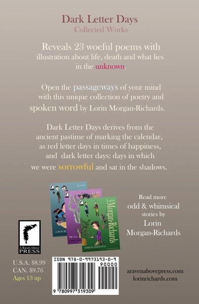 Dark Letter Days by Lorin Morgan-Richards reveals 23 woeful poems and spoken word with illustration about life, death and what lies beyond the unknown. Dark Letter Days derives from the ancient pastime of marking the calendar, as red letter days in times of happiness, and dark letter days: days in which we were sorrowful and sat in the shadows.