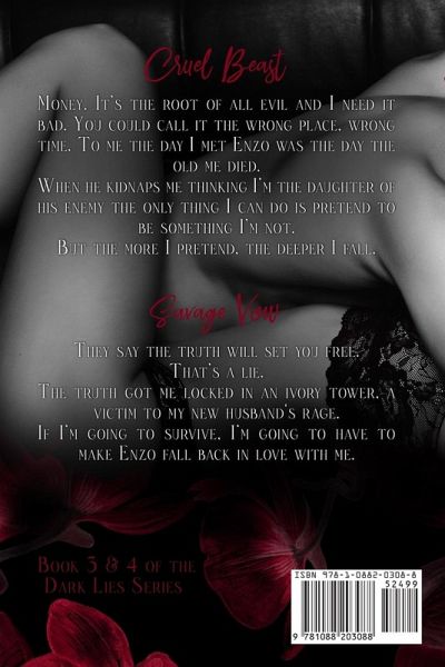 Books 3 and 4 in the Dark Lies series. This bundle includes Cruel Beast, and Savage Vow. Cruel Beast (Book 3) Money. It's the root of all evil and I need it bad. You could call it the wrong place, wrong time. To me the day I met Enzo was the day the old me died. When he kidnaps me thinking I'm the daughter of his enemy the only thing I can do is pretend to be something I'm not. But the more I pretend, the deeper I fall. Enzo is dark, cruel, and menacing but he's protective, fierce and determined. Soon he wants to forge a contract between our families, making me his bride, but he has no idea I'm not who he thinks I am and when he finds out... well I know I'm as good as dead. Savage Vow (Book 4) They say the truth will set you free. That's a lie. The truth got me locked in an ivory tower, a victim to my new husband's rage. If I'm going to survive, I'm going to have to make Enzo fall back in love with me.