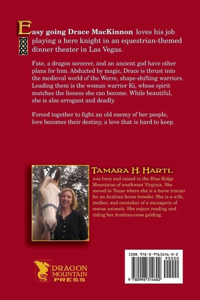 Easy-going Drace MacKinnon loves his job playing a hero knight in an equestrian themed dinner theater in Las Vegas. Fate, a dragon and an ancient god have other plans for him. Abducted by magic, Drace is thrust into the medieval world of the Were, shape-shifting warriors. Leading them is the woman warrior, Ki, whose spirit matches the lioness she can become. While beautiful, she is also arrogant and deadly. Forced together to fight an old enemy of her people, love becomes their destiny. A love that is hard to keep.