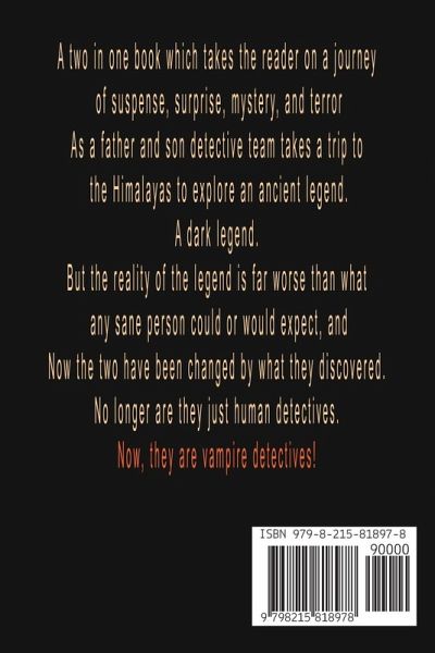 Two books that follow a father and son detective team on a trip to the Himalayas to explore an ancient legend. A dark legend. But the reality of the legend is far worse than what any sane person could or would expect, and Now the two have been changed by what they discovered. No longer are they just human detectives. A two in one book that will suck you into tales to quicken your pulse and grab you for a journey you won't forget. Now they are vampire detectives!