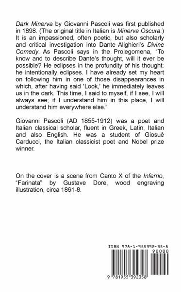 Dark Minerva by Giovanni Pascoli was first published in 1898. (The original title in Italian is Minerva Oscura.) It is an impassioned, often poetic, but also scholarly and critical investigation into Dante Alighieri¿s Divine Comedy. As Pascoli says in the Prolegomena, "To know and to describe Dante¿s thought, will it ever be possible? He eclipses in the profundity of his thought: he intentionally eclipses. I have already set my heart on following him in one of those disappearances in which, after having said ¿Look,¿ he immediately leaves us in the dark. This time I said to myself, if I see, I will always see; if I understand him in this place, I will understand him everywhere else." Giovanni Pascoli (AD 1855-1912) was a poet and Italian classical scholar, fluent in Greek, Latin, Italian and also English. He was a student of Giosuè Carducci, the Italian classicist poet and Nobel prize winner.