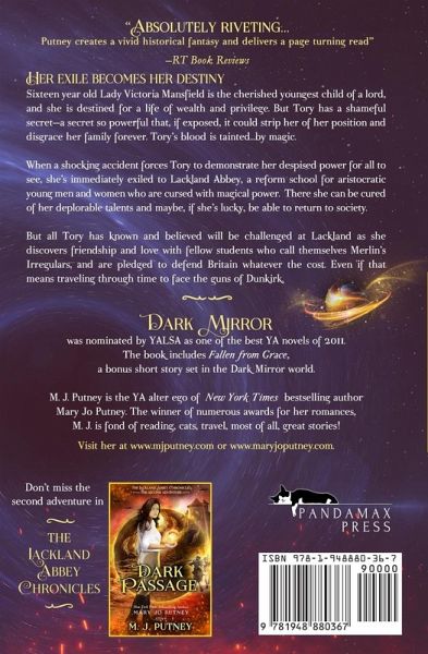 Her exile becomes her destiny Sixteen year old Lady Victoria Mansfield is the cherished youngest child of a lord, and she is destined for a life of wealth and privilege. But Tory has a shameful secret-a secret so powerful that, if exposed, it could strip her of her position and disgrace her family forever. Tory's blood is tainted...by magic. When a shocking accident forces Tory to demonstrate her despised power for all to see, she's immediately exiled to Lackland Abbey, a reform school for aristocratic young men and women who are cursed with magical power. There she can be cured of her deplorable talents and maybe, if she's lucky, be able to return to society. But all Tory has known and believed will be challenged at Lackland as she discovers friendship and love with fellow students who call themselves Merlin's Irregulars, and are pledged to defend Britain whatever the cost. Even if that means traveling through time to face the guns of Dunkirk. *Dark Mirror was nominated by YALSA as one of the best YA novels of 2011* *This book includes "Fallen From Grace," a bonus short story set in the Dark Mirror world* M. J. Putney is the YA alter ego of New York Times bestselling author Mary Jo Putney. The winner of numerous awards for her romances, M. J. is fond of reading, cats, travel, most of all, great stories! Visit her at mjputney.com or maryjoputney.com. The Lackland Abbey Chronicles:Dark Mirror Dark Passage Dark Destiny