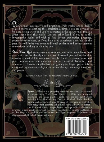 Paranormal investigative and practicing craft worlds are so deeply related but we seldom see the correlation at first. If you are or want to be a practicing witch and you're interested in the paranormal, this is a great segue into that world. On the other hand, if you're in the investigative realm and want to find some deeper exploration practices, protective techniques, or if you have in the past used experimental methods, hopefully this will bring you some additional guidance and encourage you to continue thinking outside the box. Dark Moon Light encourages you to open your mind, your heart, and your spirit to the already mystical world around you and realize that creating a magical life isn't unreasonable. It's ok to dream, hope, and plan because even the mundane can be beautiful, bountiful, and intentional. Uncover the gifts that are right at your fingertips and infuse every waking moment with your intuition, theory, ceremony, intention, and power.Awaken magic that is already inside of you.
