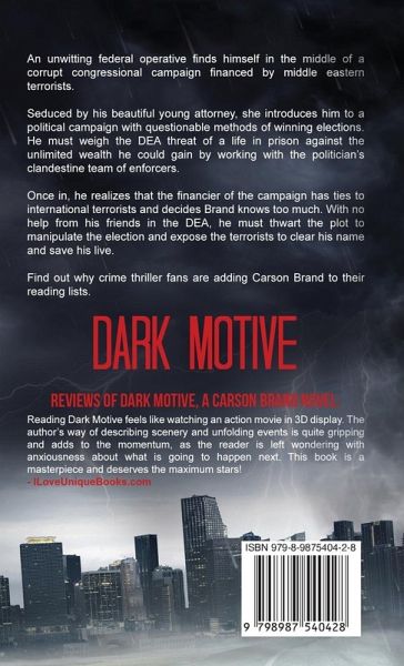 Dark Motive - A Carson Brand Novel #2 plunges Carson Brand into the sinister world of political corruption, where the stakes are higher than ever. This time, Brand finds himself caught in the web of a corrupt congressional campaign fueled by dark money from Middle Eastern terrorists. Seduced by his ambitious and alluring young attorney, Brand is introduced to a campaign that uses ruthless, questionable tactics to secure victory. Faced with an impossible choice-cooperate with the DEA and face a lifetime behind bars, or join the politician's clandestine team of enforcers and reap the rewards of unimaginable wealth-Brand must decide how far he's willing to go to stay alive. Beneath the polished smiles and media spin lies a world driven by one Dark Motive-power and control. As Brand delves deeper into this shadowy underworld, he uncovers a shocking reality about the power brokers who manipulate elections from behind the scenes. In a world where trust is a dangerous luxury and betrayal lurks around every corner, Brand must navigate a deadly path between survival and justice. Join the growing ranks of crime thriller fans who are adding Carson Brand to their must-read lists with this fast-paced, high-stakes sequel.