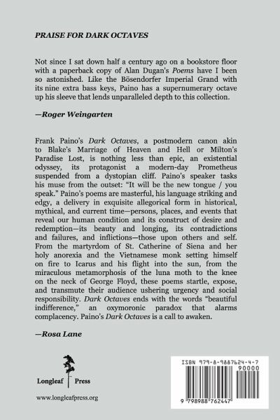 Not since I sat down half a century ago on a bookstore floor with a paperback copy of Alan Dugan's Poems have I been so astonished. Like the Bösendorfer Imperial Grand with its nine extra bass keys, Paino has a supernumerary octave up his sleeve that lends unparalleled depth to this collection. - Roger Weingarten ************* Frank Paino's Dark Octaves, a postmodern canon akin to Blake's Marriage of Heaven and Hell or Milton's Paradise Lost, is nothing less than epic, an existential odyssey, its protagonist a modern-day Prometheus suspended from a dystopian cliff. Paino's speaker tasks his muse from the outset: "It will be the new tongue / you speak." His poems are masterful, his language striking and edgy, a delivery in exquisite allegorical form in historical, mythical, and current time-persons, places, and events that reveal our human condition and its construct of desire and redemption-its beauty and longing, its contradictions and failures. From the martyrdom of St. Catherine of Siena and her holy anorexia to Icarus and his flight into the sun, from the miraculous metamorphosis of the luna moth to the knee on the neck of George Floyd, these poems startle, expose, and transmute their audience, ushering urgency and social responsibility. Dark Octaves ends with the words "beautiful indifference," an oxymoronic paradox that alarms complacency. Paino's Dark Octaves is a call to awaken. -Rosa Lane