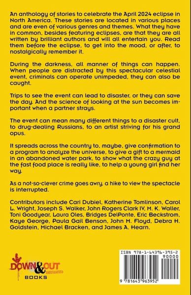 An anthology of stories to celebrate the April 2024 eclipse in North America. These stories are located in various places and are even of various genres and themes. What they have in common, besides featuring eclipses, are that they are all written by brilliant authors and will all entertain you. Read them before the eclipse, to get into the mood, or after, to nostalgically remember it. During the darkness, all manner of things can happen. When people are distracted by this spectacular celestial event, criminals can operate unimpeded, they can also be caught. Trips to see the event can lead to disaster, or they can save the day. And the science of looking at the sun becomes important when a partner strays. The event can mean many different things to a disaster cult, to drug-dealing Russians, to an artist striving for his grand opus. It spreads across the country to, maybe, give confirmation to a program to analyze the universe, to give a gift to a mermaid in an abandoned water park, to show what the crazy guy at the fast food place is really like, to help a young girl find her way. As a not-so-clever crime goes awry, a hike to view the spectacle is interrupted. Contributors include Cari Dubiel, Katherine Tomlinson, Carol L. Wright, Joseph S. Walker, John Rogers Clark IV, M. K. Waller, Toni Goodyear, Laura Oles, Bridges DelPonte, Eric Beckstrom, Kaye George, Paula Gail Benson, John M. Floyd, Debra H. Goldstein, Michael Bracken, and James A. Hearn.