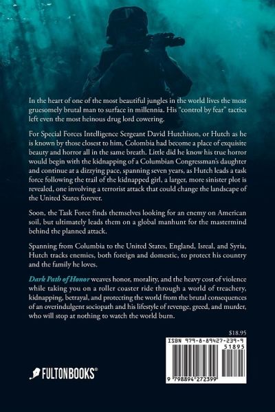In the heart of one of the most beautiful Jungles in the world lives the most gruesomely brutal man to surface in millennia. His "control by fear" tactics left even the most heinous drug lord cowering. For Special Forces Intelligence Sergeant David Hutchison, or Hutch as he is known by those closest to him, Colombia had become a place of exquisite beauty and horror all in the same breath. Little did he know his true horror would begin with the kidnapping of a Columbian Congressman's daughter and continue at a dizzying pace, spanning seven years, as Hutch leads a task force following the trail of the kidnapped girl, a larger, more sinister plot is revealed, one involving a terrorist attack that could change the landscape of the United States forever. Soon, the Task Force finds themselves looking for an enemy on American soil, but ultimately leads them on a global manhunt for the mastermind behind the planned attack. Spanning from Columbia to the United States, England, Isreal, and Syria, Hutch tracks enemies, both foreign and domestic, to protect his country and the family he loves. Dark Path of Honor weaves honor, morality, and the heavy cost of violence while taking you on a roller coaster ride through a world of treachery, kidnapping, betrayal, and protecting the world from the brutal consequences of an overindulgent sociopath and his lifestyle of revenge, greed, and murder, who will stop at nothing to watch the world burn.