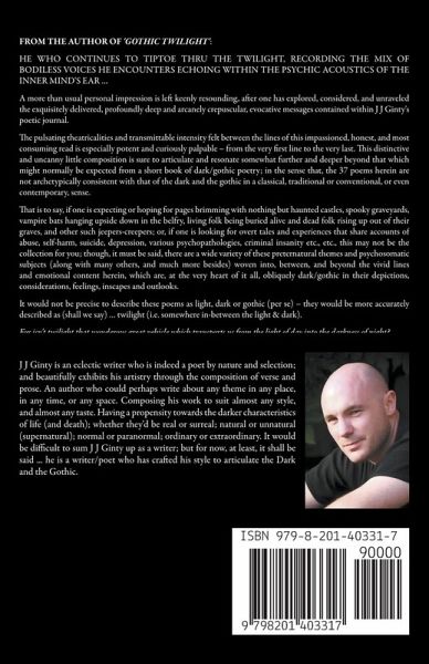 FROM THE AUTHOR OF 'GOTHIC TWILIGHT': HE WHO CONTINUES TO TIPTOE THRU THE TWILIGHT, RECORDING THE MIX OF BODILESS VOICES HE ENCOUNTERS ECHOING WITHIN THE PSYCHIC ACOUSTICS OF THE INNER MIND'S EAR … A more than usual personal impression is left keenly resounding, after one has explored, considered, and unraveled the exquisitely delivered, profoundly deep and arcanely crepuscular, evocative messages contained within J J Ginty's poetic journal. The pulsating theatricalities and transmittable intensity felt between the lines of this impassioned, honest, and most consuming read is especially potent and curiously palpable – from the very first line to the very last. This distinctive and uncanny little composition is sure to articulate and resonate somewhat further and deeper beyond that which might normally be expected from a short book of dark/gothic poetry; in the sense that, the 37 poems herein are not archetypically consistent with that of the dark and the gothic in a classical, traditional or conventional, or even contemporary, sense. That is to say, if one is expecting or hoping for pages brimming with nothing but haunted castles, spooky graveyards, vampire bats hanging upside down in the belfry, living folk being buried alive and dead folk rising up out of their graves, and other such jeepers-creepers; or, if one is looking for overt tales and experiences that share accounts of abuse, self-harm, suicide, depression, various psychopathologies, criminal insanity etc., etc., this may not be the collection for you; though, it must be said, there are a wide variety of these preternatural themes and psychosomatic subjects (along with many others, and much more besides) woven into, between, and beyond the vivid lines and emotional content herein, which are, at the very heart of it all, obliquely dark/gothic in their depictions, considerations, feelings, inscapes and outlooks. It would not be precise to describe these poems as light, dark or gothic (per se) – they would be more accurately described as (shall we say) … twilight (i.e. somewhere in-between the light & dark). For isn't twilight that wonderous great vehicle which transports us from the light of day into the darkness of night? J J Ginty does so colorfully express that which he conceives – born out of that which he perceives – thus communicating and connecting with those of us who decidedly share in similar proclivities: those of us (albeit so very few of us) who perhaps appreciate the widely interweaving, multifarious and provocative twilit themes to be found within one's own life, … death, … afterlife … This book was conceived, born and nurtured out of ordinary day-to-day life and its mortal, earthly, mundane happenings ('reality', if you will), leading the author to produce this collection; effectively displaying his very own idiosyncratic take on Strange & Peculiar Reality. Contains strong language. Dedicated to the 'Isolationist': Those who generally feel somewhat adrift Those who perhaps feel they are something 'other' Those who don't always believe in what is seen, heard, taught or disclosed Those who are of a deep & introspective nature Those who occasionally like to stick two fingers up at the external world Those who are inwardly travelling Time. In Appreciation. Always. J J Ginty