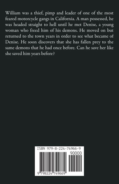 William was a thief, pimp and leader of one of the most feared motorcycle gangs in California. A man possessed, he was headed straight to hell until he met Denise, a young woman who freed him of his demons. He moved on but returned to the town years in order to see what became of Denise. He soon discovers that she has fallen prey to the same demons that he had once before. Can he save her like she saved him years before?