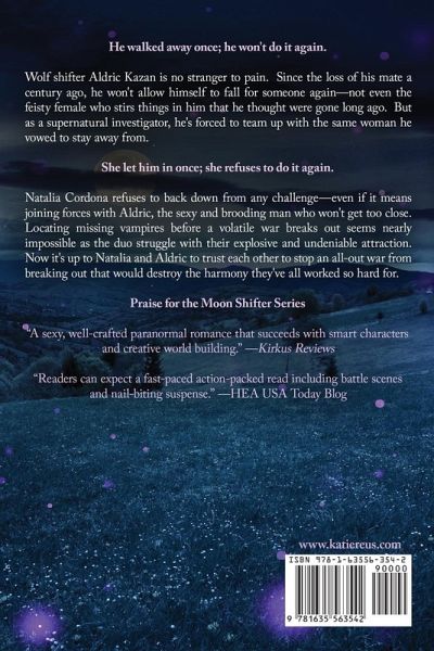 He walked away once; he won't do it again. Wolf shifter Aldric Kazan is no stranger to pain. Since the loss of his mate a century ago, he won't allow himself to fall for someone again-not even the feisty female who stirs things in him that he thought were gone long ago. But as a supernatural investigator, he's forced to team up with the same woman he vowed to stay away from. She let him in once; she refuses to do it again. Natalia Cordona refuses to back down from any challenge-even if it means joining forces with Aldric, the sexy and brooding man who won't get too close. Locating missing vampires before a volatile war breaks out seems nearly impossible as the duo struggle with their explosive and undeniable attraction. Now it's up to Natalia and Aldric to trust each other to stop an all-out war from breaking out that would destroy the harmony they've all worked so hard for.