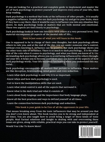 If you are looking for a practical and complete guide to implement and master the art of Dark psychology to protect yourself and improve every area of your life, then keep reading.. Dark psychology is a method that looks at the influence of other people... It is usually a negative influence. People who use dark psychology try and get into your brain, since if they have a say there, then it would be easy to influence you into any situation they desire. So dark psychology looks at matters that are both mental and emotional. These two aspects are tied closely to psychology. Dark psychology looks at how one interacts with others at a very personal, intimate level... This material encompasses all aspects of the mental side of life... You are supposed to be in charge of their own thoughts, but dark psychology allows others to rule you... and at the end of the day, you are under someone else's control, without even knowing it. Influence can be positive, but dark psychology shows you the other toxic side of influence.. There is so much to dark psychology... It is the other side of the coin when it comes to "normal" psychology and what you think you know about it. Understanding dark psychology allows you to avoid being influenced by others throughout your life. It helps you to become more confident once you know all the aspects of how dark psychology works. Your life becomes fascinating when you understand this material.. Dark psychology encompasses all matters that pertain to influence. These matters are things such as deception, brainwashing, mind games and even seduction. Here is just some of what you will learn in this book: ¿Learn what dark psychology is and why it is so important. ¿Know when and how dark psychology is used. ¿Get to learn the manipulation skills that are used. ¿Learn what mind control is and all the aspects that surround it. ¿Know what is the dark triad and what it consists of. ¿Learn about body language and the importance that body language plays in manipulation. ¿Know all the best practices and ways to defend yourself at all times. ¿Learn the connection between dark psychology and seduction. This book is your guide to be free of all the oppressors in your life. That means breaking away from the toxic influencers that may be around you that you don't even know about. This book teaches you to be strong and independent at all times. You are also taught how to avoid being a target of these kinds of toxic people. Real factual solutions and insight to dealing with and overcoming these issues are given, along with reliable, practical steps you can take to protect yourself. Would You Like To Know More? Scroll up the top of this page and click the ADD TO CART Button and begin learning all of the ways dark psychology can be used..