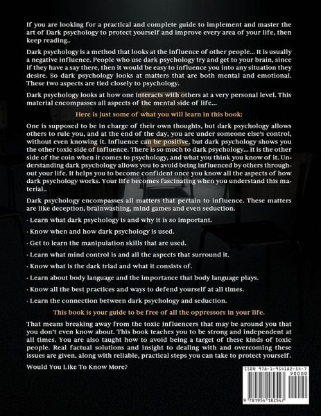 If you are looking for a practical and complete guide to implement and master the art of Dark psychology to protect yourself and improve every area of your life, then keep reading... Dark psychology is a method that looks at the influence of other people... It is usually a negative influence. People who use dark psychology try and get into your brain, since if they have a say there, then it would be easy to influence you into any situation they desire. So dark psychology looks at matters that are both mental and emotional. These two aspects are tied closely to psychology. Dark psychology looks at how one interacts with others at a very personal, intimate level... This material encompasses all aspects of the mental side of life... You are supposed to be in charge of their own thoughts, but dark psychology allows others to rule you... and at the end of the day, you are under someone else's control, without even knowing it. Influence can be positive, but dark psychology shows you the other toxic side of influence. There is so much to dark psychology... It is the other side of the coin when it comes to "normal" psychology and what you think you know about it. Understanding dark psychology allows you to avoid being influenced by others throughout your life. It helps you to become more confident once you know all the aspects of how dark psychology works. Your life becomes fascinating when you understand this material.. Dark psychology encompasses all matters that pertain to influence. These matters are things such as deception, brainwashing, mind games and even seduction. Here is just some of what you will learn in this book: ¿Learn what dark psychology is and why it is so important. ¿Know when and how dark psychology is used. ¿Get to learn the manipulation skills that are used. ¿Learn what mind control is and all the aspects that surround it. ¿Know what is the dark triad and what it consists of. ¿Learn about body language and the importance that body language plays in manipulation. ¿Know all the best practices and ways to defend yourself at all times. ¿Learn the connection between dark psychology and seduction. This book is your guide to be free of all the oppressors in your life. That means breaking away from the toxic influencers that may be around you that you don't even know about. This book teaches you to be strong and independent at all times. You are also taught how to avoid being a target of these kinds of toxic people. Real factual solutions and insight to dealing with and overcoming these issues are given, along with reliable, practical steps you can take to protect yourself. Would You Like To Know More? Scroll up the top of this page and click the ADD TO CART Button and begin learning all of the ways dark psychology can be used..¿