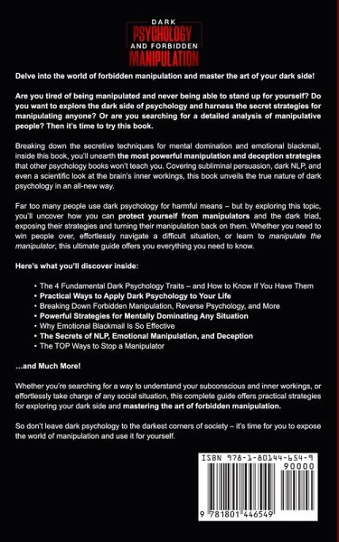 Delve into the world of forbidden manipulation and master the art of your dark side! Are you tired of being manipulated and never being able to stand up for yourself? Do you want to explore the dark side of psychology and harness the secret strategies for manipulating anyone? Or are you searching for a detailed analysis of manipulative people? Then it's time to try this book. Breaking down the secretive techniques for mental domination and emotional blackmail, inside this book, you'll unearth the most powerful manipulation and deception strategies that other psychology books won't teach you. Covering subliminal persuasion, dark NLP, and even a scientific look at the brain's inner workings, this book unveils the true nature of dark psychology in an all-new way. Far too many people use dark psychology for harmful means - but by exploring this topic, you'll uncover how you can protect yourself from manipulators and the dark triad, exposing their strategies and turning their manipulation back on them. Whether you need to win people over, effortlessly navigate a difficult situation, or learn to manipulate the manipulator, this ultimate guide offers you everything you need to know. Here's what you'll discover inside: The 4 Fundamental Dark Psychology Traits - and How to Know If You Have Them Practical Ways to Apply Dark Psychology to Your Life Breaking Down Forbidden Manipulation, Reverse Psychology, and More Powerful Strategies for Mentally Dominating Any Situation Why Emotional Blackmail Is So Effective The Secrets of NLP, Emotional Manipulation, and Deception The TOP Ways to Stop a Manipulator ...and Much More! Whether you're searching for a way to understand your subconscious and inner workings, or effortlessly take charge of any social situation, this complete guide offers practical strategies for exploring your dark side and mastering the art of forbidden manipulation. So don't leave dark psychology to the darkest corners of society - it's time for you to expose the world of manipulation and use it for yourself.