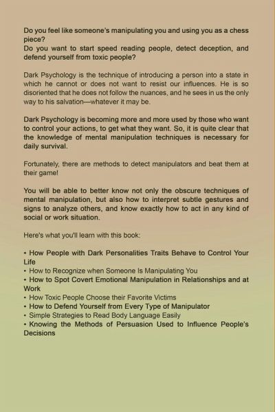 Do you feel like someone's manipulating you and using you as a chess piece? Do you want to start speed reading people, detect deception, and defend yourself from toxic people? Dark Psychology is the technique of introducing a person into a state in which he cannot or does not want to resist our influences. He is so disoriented that he does not follow the nuances, and he sees in us the only way to his salvation-whatever it may be. Dark Psychology is becoming more and more used by those who want to control your actions, to get what they want. So, it is quite clear that the knowledge of mental manipulation techniques is necessary for daily survival. Fortunately, there are methods to detect manipulators and beat them at their game! You will be able to better know not only the obscure techniques of mental manipulation, but also how to interpret subtle gestures and signs to analyze others, and know exactly how to act in any kind of social or work situation. Here's what you'll learn with this book: · How People with Dark Personalities Traits Behave to Control Your Life · How to Recognize when Someone Is Manipulating You · How to Spot Covert Emotional Manipulation in Relationships and at Work · How Toxic People Choose their Favorite Victims · How to Defend Yourself from Every Type of Manipulator · Simple Strategies to Read Body Language Easily · Knowing the Methods of Persuasion Used to Influence People's Decisions