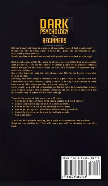 Did you know that there is a branch of psychology called dark psychology? Would you like to know about a topic that gives you advantages in your relationship with others? Would you like to know how to deal with people who use dark psychology? Dark psychology, unlike the name implies, is not something bad or associated with darkness. It means the ability of certain people to manipulate external minds and get the best out of them. As such, this becomes an important topic to dive into deeply. One of the greatest tools that will change your life for the better is learning to read people. Knowing how other people communicate is a great way to improve your own communication skills without saying a word. It is why it is essential to learn how to read others because others always read you! In this book, you will get information on dealing with people who use dark psychology as a weapon to overcome situations. Overall, you will be more controlled and less vulnerable to external emotional carnage. Through the pages of this book, you will learn: - How to save yourself from mind manipulators and mind control; - Understanding the psyche on how a mind operates; - How to be more aware of our behavior with others; - How to get going in all situations without being provoked; - Underlying tactics can be used to motivate people; - And much more... It will not be a generic reading, but a topic with numerous case studies! What are you waiting for? You will thank yourself for choosing to read this book!