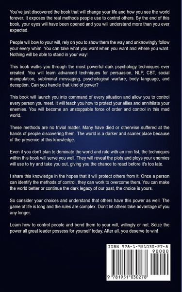Dark Psychology Series Book #3 You've just discovered the book that will change your life and how you see the world forever. It exposes the real methods people use to control others. By the end of this book, your eyes will have been opened and you will understand more than you ever expected. People will bow to your will, rely on you to show them the way and unknowingly follow your every whim. You can take what you want when you want and where you want. Nothing will be able to stand in your way! This book walks you through the most powerful dark psychology techniques ever created. You will learn advanced techniques for persuasion, NLP, CBT, social manipulation, subliminal messaging, psychological warfare, body language, and deception. Can you handle that kind of power? This book will launch you into command of every situation and allow you to control every person you meet. It will teach you how to protect your allies and annihilate your enemies. You will become an unstoppable force of order and control in this mad world. These methods are no trivial matter. Many have died or otherwise suffered at the hands of people discovering them. The world is a darker and scarier place because of the presence of this knowledge. Even if you don't plan to dominate the world and rule with an iron fist, the techniques within this book will serve you well. They will reveal the plots and ploys your enemies will use to try and take you out, giving you the chance to react before it's too late. I share this knowledge in the hopes that it will protect others from it. Once a person can identify the methods of control, they can work to overcome them. You can make the world better or continue the dark legacy of our past, the choice is yours. So consider your choices and understand that others have this power as well. The game of life is long and the rules are complex. Don't let others take advantage of you any longer. Learn how to control people and bend them to your will, willingly or not. Seize the power all great leader possess for yourself today. After all, you deserve to win!