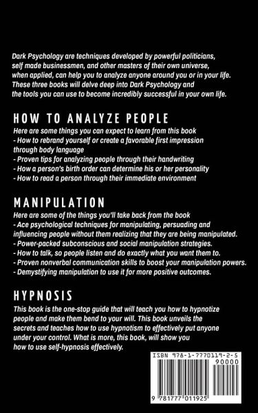 Caution This incredible book contains powerful psychological techniques to influence people at will. Bewarned your buying this book at your own risk. Dark Psychology are techniques developed by powerful politicians, self-made businessmen, and other masters of their own universe, when applied, can help you to analyze anyone around you or in your life. These three books will delve deep into Dark Psychology and the tools you can use to become incredibly successful in your own life. How To Analyze People Here are some things you can expect to learn from this book How to rebrand yourself or create a favorable first impression through body language Proven tips for analyzing people through their handwriting How a person's birth order can determine his or her personality How to read a person through their immediate environment Manipulation Here are some of the things you'll take back from the book Ace psychological techniques for manipulating, persuading and influencing people without them realizing that they are being manipulated. Power-packed subconscious and social manipulation strategies. How to talk, so people listen and do exactly what you want them to. Proven nonverbal communication skills to boost your manipulation powers. Demystifying manipulation to use it for more positive outcomes. Hypnosis This book is the one-stop guide that will teach you how to hypnotize people and make them bend to your will. This book unveils the secrets and teaches how to use hypnotism to effectively put anyone under your control. What is more, this book, will show you how to use self-hypnosis effectively.