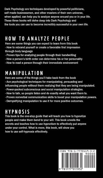 Caution This incredible book contains powerful psychological techniques to influence people at will. Bewarned your buying this book at your own risk. Dark Psychology are techniques developed by powerful politicians, self-made businessmen, and other masters of their own universe, when applied, can help you to analyze anyone around you or in your life. These three books will delve deep into Dark Psychology and the tools you can use to become incredibly successful in your own life. How To Analyze People Here are some things you can expect to learn from this book How to rebrand yourself or create a favorable first impression through body language Proven tips for analyzing people through their handwriting How a person’s birth order can determine his or her personality How to read a person through their immediate environment Manipulation Here are some of the things you’ll take back from the book Ace psychological techniques for manipulating, persuading and influencing people without them realizing that they are being manipulated. Power-packed subconscious and social manipulation strategies. How to talk, so people listen and do exactly what you want them to. Proven nonverbal communication skills to boost your manipulation powers. Demystifying manipulation to use it for more positive outcomes. Hypnosis This book is the one-stop guide that will teach you how to hypnotize people and make them bend to your will. This book unveils the secrets and teaches how to use hypnotism to effectively put anyone under your control. What is more, this book, will show you how to use self-hypnosis effectively.