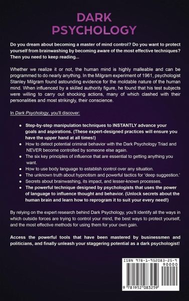 Do you dream about becoming a master of mind control? Do you want to protect yourself from brainwashing by becoming aware of the most effective techniques? Then you need to keep reading... Whether we realize it or not, the human mind is highly malleable and can be programmed to do nearly anything. In the Milgram experiment of 1961, psychologist Stanley Milgram found astounding evidence for the moldable nature of the human mind. When influenced by a skilled authority figure, he found that his test subjects were willing to carry out shocking actions, many of which clashed with their personalities and most strikingly, their conscience. In Dark Psychology, you’ll discover: Step-by-step manipulation techniques to INSTANTLY advance your goals and aspirations. (These expert-designed practices will ensure you have the upper hand at all times!) How to detect potential criminal behavior with the Dark Psychology Triad and NEVER become controlled by someone else again. The six key principles of influence that are essential to getting anything you want. How to use body language to establish control over any situation. The unknown truth about hypnotism and powerful tactics for ‘deep suggestion.’ Secrets about brainwashing, its impact, and lesser-known processes. The powerful technique designed by psychologists that uses the power of language to influence thought and behavior. (Unlock secrets about the human brain and learn how to reprogram it to suit your every need!) And much, much more… As a FREE bonus, you’ll also receive a chapter from Emotional Intelligence: Understand Your Emotions and Create Profound Relationships because we truly believe that with a firm grasp of your emotional state, no malicious outside force will ever be able to penetrate your mind again. Even if you’re socially awkward, have no social influence whatsoever, or are continuously ignored by everyone around you, the extensive research behind this guide can ensure that you’ll learn all the secrets of the malleable human mind and how to compel anyone to do as you desire, employing the same techniques used by the world’s most influential people. By relying on the expert research behind Dark Psychology, you’ll identify all the ways in which outside forces are trying to control your mind, the best ways to protect yourself, and the most effective methods for using them for your own gain. If you want to access the powerful tools that have been mastered by businessmen and politicians, and finally unleash your staggering potential as a dark psychologist, you should read this book!