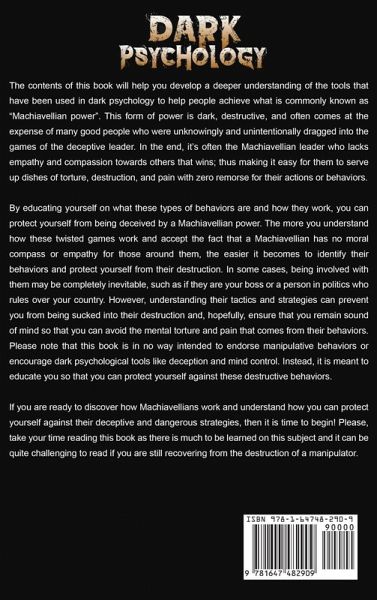If want to discover how people with dark personalities work and understand how you can protect yourself against their deceptive and dangerous strategies, then keep reading... Have you ever been subjected to the painful and damaging behaviors of people who seem to lack morals? Have you ever been the victim of negative humor designed to poke at your weaknesses and disempower you? Would you like to know how to protect yourself against these dark strategies so you can avoid being manipulated or get sucked into their false reality at the expense of your own sanity? You see, the art of dark psychology has long been researched by scientists to attempt to understand what it is that allows people to ruthlessly chase their dreams at the expense of everyone around them. In Dark Psychology: What Machiavellian People of Power Know about Persuasion, Mind Control, Manipulation, Negotiation, Deception, Human Behavior, and Psychological Warfare that You Don't, you are going to discover exactly how these manipulative people suck others into their deceptive ways and win at everything they do - no matter what the cost may be. This book will also show you how to protect yourself against these dark strategies so you can avoid being manipulated or sucked into their false reality at the expense of your own sanity. Here's just a tiny fraction of what you'll discover: The eight laws of human behavior and how manipulative people use these behaviors to their advantage The six scientific principles of persuasion and how a manipulator will use these to persuade anyone to agree with them, seemingly on their own terms Mind control techniques that Machiavellian leaders and manipulators use to try and bend your reality and keep you at their mercy Manipulative negotiation tactics people use to get you to take their deal while making it seem like it was your idea 19 manipulation strategies predators use to lure people into their deceptive games The art of deceptive winning and how manipulators will use deception as a carefully selected tool so that they can easily win at anything they do And much, much more! Please note that this book is in no way intended to endorse manipulative behaviors or encourage dark psychological tools like deception and mind control. Instead, it is meant to educate you so that you can protect yourself against these destructive behaviors. So if you want to learn more about dark psychology, scroll up and click "add to cart"!