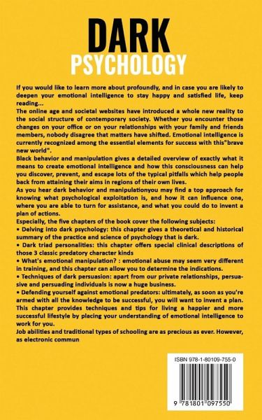 If you would like to learn more about profoundly, and in case you are likely to deepen your emotional intelligence to stay happy and satisfied life, keep reading... The online age and societal websites have introduced a whole new reality to the social structure of contemporary society. Whether you encounter those changes in your office or on your relationships with your family and friends members, nobody disagrees that matters have shifted. Emotional intelligence is currently recognized among the essential elements for success with this"brave new world". Black behavior and manipulation give a detailed overview of exactly what it means to create emotional intelligence and how this consciousness can help you discover, prevent, and escape lots of the typical pitfalls which help people back from attaining their aims in regions of their own lives. As you hear dark behavior and manipulation you may find a top approach for knowing what psychological exploitation is, and how it can influence one, where you are able to turn for assistance, and what you could do to invent a plan of action. Especially, the five chapters of the book cover the following subjects: Delving into dark psychology: this chapter gives a theoretical and historical summary of the practice and science of psychology that is dark. Dark triad personalities: this chapter offers special clinical descriptions of those 3 classic predatory character kinds What's emotional manipulation ? : emotional abuse may seem very different in training, and this chapter can allow you to determine the indications. Techniques of dark persuasion: apart from our private relationships, persuasive and persuading individuals is now a huge business. Defending yourself against emotional predators: ultimately, as soon as you're armed with all the knowledge to be successful, you will want to invent a plan. This chapter provides techniques and tips for living a happier and more successful lifestyle by placing your understanding of emotional intelligence to work for you. Job abilities and traditional types of schooling are as precious as ever. However, as electronic communication, social networking, along with the shifting workplace are still evolving, we're faced with a fresh set of challenges that take a new and distinct reaction. Just knowing what's holding us back is not enough. Dark trainers and manipulation not just provides you the knowledge and skills to understand where to search for replies but also demonstrates the way your newfound understanding of emotional intelligence will be able to help you achieve greater success and happiness. Don't permit yourself to live a different day at oblivion. Get prepared to work out the difficult questions by listening to the audiobook. You may educate yourself for selecting to listen to the publication. Subscribe to the cover of the page and click on the"purchase now" button. Your secret to rebounding straight back from hardship is just click away.