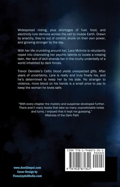 Widespread rioting, plus shortages of fuel, food, and electricity lure demons across the veil to invade Earth. Drawn by anarchy, they’re out of control, drunk on their own power, and growing stronger by the day. With her life crumbling around her, Lara McInnis is reluctantly roped into channeling her psychic talents to locate a missing teen. Her lack of skill strands her in the murky underbelly of a world inhabited by dark forces. Trevor Denoble’s Celtic blood yields unexpected gifts. After years of uncertainty, Lara is really and truly finally his, and he’s determined to keep her by his side. No stranger to violence, more blood on his hands is a small price to pay to keep the woman he loves safe.