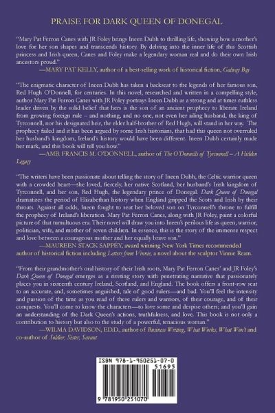Emerging out of the Gaelic past, a remarkable woman, Ineen Dubh, walks and rides across the pages of Mary Pat Ferron Canes' and JR Foley's historical novel as bravely and as tangibly as her historical counterpart. Breaking the constrictions of a woman's role in the 16th Century, this Dark Queen of Donegal moves through this Irish historical fiction like a tempest. This "Dark Queen" foreshadows powerful changes in Ireland toward independence and in the rise of feminism that would take place a few hundred years after Ineen's rebellion. The authors recreate this 16th Century adventure on the Emerald Isle with passion and action. Meticulously researched with personal insight from oral histories of Irish Clans and the author's grandmother and others, Dark Queen of Donegal is a story of honor and betrayals, kidnappings, imprisonment, and assassinations in Ireland, Scotland, and England. The book offers a front-row seat to an accurate, and, sometimes anguished, tale of rulers and warriors. Readers will feel what it was like to be amongst these rulers and warriors, learn of their courage, love, hatreds, and conquests. Readers will gain an understanding of the Dark Queen and her famous, heroic son Red Hugh. This book is a highly readable contribution to a view of history and to revelations about a powerful, tenacious real woman leader. Ineen is married to an Irish "king" when her Scots relatives are slaughtered not far from Donegal's southern border. Elizabeth I despises the Queen of Donegal and orders the Crown to kidnap that Queen's 14-year-old son. The plot succeeds. Ineen believes an ancient Irish prophecy that her son, the Irish hero Red Hugh, is destined to succeed his father, and save the kingdom. She will do anything to rescue her son and alter the course of Donegal Castle's history.