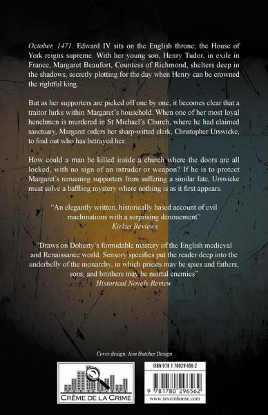 Christopher Urswicke must unmask the traitor lurking amongst Margaret Beaufort's supposedly loyal followers in this gripping medieval mystery. October, 1471. Edward IV sits on the English throne; the House of York reigns supreme. With her young son, Henry Tudor, in exile in France, Margaret Beaufort, Countess of Richmond, shelters deep in the shadows, secretly plotting for the day when Henry can be crowned the rightful king. But as her supporters are picked off one by one, it becomes clear that a traitor lurks within Margaret's household. When one of her most loyal henchmen, Jacob Cromart, is murdered in St Michael's Church, where he had claimed sanctuary, Margaret orders her sharp-witted clerk, Christopher Urswicke, to find out who has betrayed her. How could a man be killed inside a church where the doors are all locked, with no sign of an intruder or weapon? If he is to protect Margaret's remaining supporters from suffering a similar fate, Urswicke must solve a baffling mystery where nothing is as it first appears.