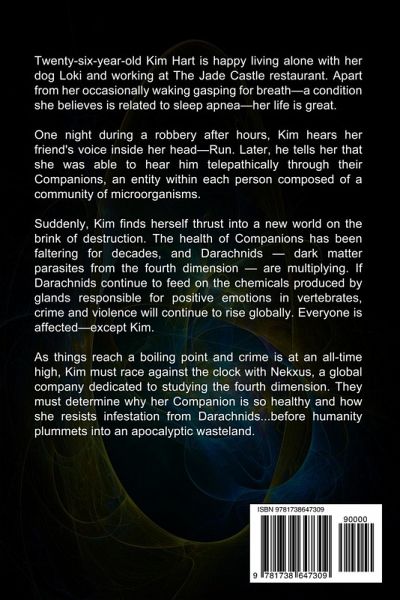 Twenty-six-year-old Kim Hart is happy living alone with her dog Loki and working at The Jade Castle restaurant. Apart from her occasionally waking gasping for breath-a condition she believes is related to sleep apnea-her life is great. One night during a robbery after hours, Kim hears her friend's voice inside her head-Run. Later, he tells her that she was able to hear him telepathically through their Companions, an entity within each person composed of a community of microorganisms. Suddenly, Kim finds herself thrust into a new world on the brink of destruction. The health of Companions has been faltering for decades, and Darachnids - dark matter parasites from the fourth dimension - are multiplying. If Darachnids continue to feed on the chemicals produced by glands responsible for positive emotions in vertebrates, crime and violence will continue to rise globally. Everyone is affected-except Kim. As things reach a boiling point and crime is at an all-time high, Kim must race against the clock with Nekxus, a global company dedicated to studying the fourth dimension. They must determine why her Companion is so healthy and how she resists infestation from Darachnids...before humanity plummets into an apocalyptic wasteland.