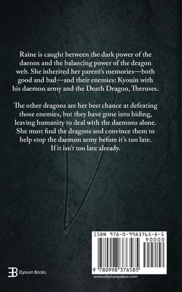Book two in the Elysium's Fall dark fantasy duology.Raine is caught between the dark power of the daenox and the balancing power of the dragon web. She inherited her parent's memories-both good and bad-and their enemies: Kyouin with his daemon army and the Death Dragon, Theruses.The other dragons are her best chance at defeating those enemies, but they have gone into hiding, leaving humanity to deal with the daemons alone. She must find the dragons and convince them to help stop the daemon army before it's too late. If it isn't too late already.