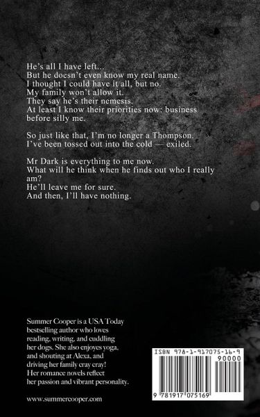 Enjoy this steamy good girl gone bad love story by USA Today Bestselling sexy billionaire romance author Summer Cooper! He's all I have left...But he doesn't even know my real name. I thought I could have it all, but no. My family won't allow it. They say he's their nemesis. At least I know their priorities now: business before silly me. So just like that, I'm no longer a Thompson. I've been tossed out into the cold - exiled. Mr Dark is everything to me now. What will he think when he finds out who I really am? He'll leave me for sure. And then, I'll have nothing. READ THE WHOLE SERIES NOW: 1.…mehr