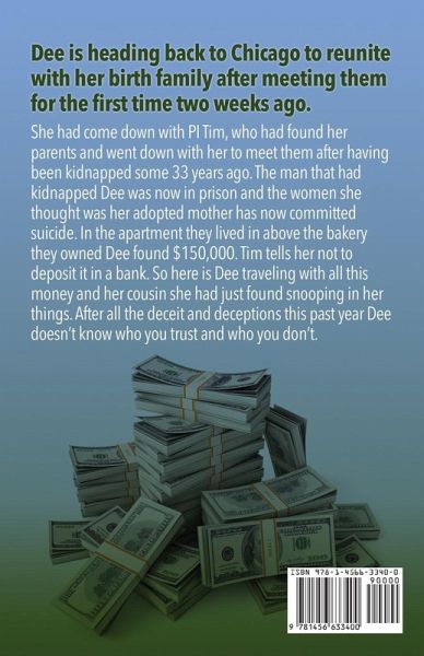 Dee is heading back to Chicago to reunite with her birth family after meeting them for the first time two weeks ago. She had come down with PI Tim, who had found her parents and went down with her to meet them after having been kidnapped some 33 years ago. The man that had kidnapped Dee was now in prison and the women she thought was her adopted mother has now committed suicide. In the apartment they lived in above the bakery they owned Dee found $150,000. Tim tells her not to deposit it in a bank. So here is Dee traveling with all this money and her cousin she had just found snooping in her things. After all the deceit and deceptions this past year Dee doesn’t know who you trust and who you don’t.