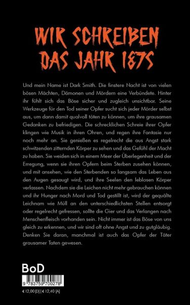 Wir schreiben das Jahr 1875. Und mein Name ist Dark Smith. Die finstere Nacht ist von vielen bösen Mächten, Dämonen und Mördern eine Verbündete. Hinter ihr fühlt sich das Böse sicher und zugleich unsichtbar. Seine Werkzeuge für den Tod seiner Opfer sucht sich jeder Mörder selbst aus, um dann damit qualvoll töten zu können, um ihre grausamen Gedanken zu befriedigen. Die schrecklichen Schreie ihrer Opfer klingen wie Musik in ihren Ohren, und regen ihre Fantasie nur noch mehr an. Sie genießen es regelrecht die aus Angst stark schwitzenden zitternden Körper zu sehen und das Gefühl der Macht zu haben. Sie weiden sich in einem Meer der Überlegenheit und der Erregung, wenn sie ihren Opfern beim Sterben zusehen können, und mit ansehen, wie den Sterbenden so langsam das Leben aus den Augen gesaugt wird, und ihre Seelen den leblosen Körper verlassen. Nachdem sie die Leichen nicht mehr gebrauchen können und ihr Hunger nach Mord und Tod gestillt ist, wird der gequälte Leichnam wie Müll an den unterschiedlichsten Stellen entsorgt oder regelrecht gefressen, sollte die Gier und das Verlangen nach Menschenfleisch vorhanden sein. Nicht immer ist das Böse von uns gleich zu erkennen, und wir sind oft ohne Angst und zu gutgläubig. Denken Sie daran, manchmal ist auch das Opfer der Täter grausamer Taten gewesen.