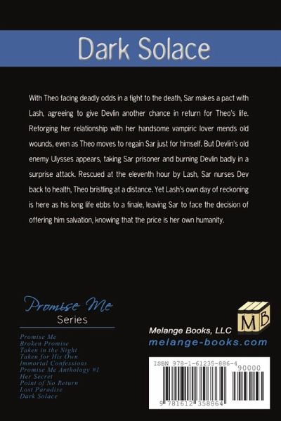 With Theo facing deadly odds in a fight to the death, Sar makes a pact with Lash, agreeing to give Devlin another chance in return for Theo's life. Reforging her relationship with her handsome vampiric lover mends old wounds, even as Theo moves to regain Sar just for himself. But Devlin's old enemy Ulysses appears, taking Sar prisoner and burning Devlin badly in a surprise attack. Rescued at the eleventh hour by Lash, Sar nurses Dev back to health, Theo bristling at a distance. Yet Lash's own day of reckoning is here as his long life ebbs to a finale, leaving Sar to face the decision of offering him salvation, knowing that the price is her own humanity.