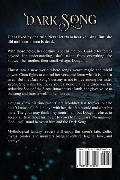 Ciara lived by one rule. Never let them hear you sing. But, she did and now a man is dead. With those notes, her destiny is set in motion. Guided by forces beyond her understanding, she's taken from everything she knows-her mother, their small village, Dougan... Thrust into a new world where songs weave magic and wield power, Ciara fights to control her verse and learn what it is to be a siren. But the Dark Song's destiny is not to live among her sister sirens. She walks the rocky shores alone until she discovers the seductive Song of the Siren. Innocent as a lamb, she gives voice to the song and lures a wolf to her shores. Dougan knew his time with Ciara wouldn't last forever, but he didn't know he'd fall in love with her, that fate would make her his mate. The gods may think they control all, but Dougan refuses to accept a life without his love. He vows to find Ciara. No man-or God-will stand between him and the Dark Song. Mythological fantasy readers will enjoy this siren's tale. Celtic myths, pirates, and monsters bring adventure, legend, love, and betrayal. Dark Song has it all. Get your copy today! **Content Warning** includes scenes of imprisonment and torture and some sexual content. Mature audiences only. This is only the beginning for Ciara and Dougan and this story ends on a cliffhanger. Final Verse, the rest of their story, is coming soon!