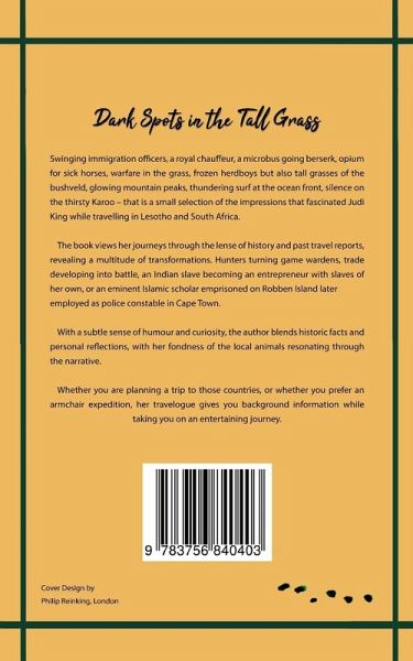 Ob tanzende Grenzbeamte, freundliche Giraffen oder verblüffte Nashörner, Judi King's Buch 'Dark Spots in the Tall Grass' bietet neben persönlichen Beobachtungen vielfältige Einblicke in die Geschichte von Lesotho und Südafrika. Eine unterhaltsame Reisebeschreibung, die das Unerwartete mit historischen Bezügen verbindet.A journey through Lesotho and South Africa experiencing the unexpected from eloquent animals to a vehicle going berserk. With a sense of curiosity and humour, the author blends historic facts and personal reflections. Her travelogue gives you background information while taking you on an entertaining journey.