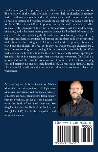 Look around you. It is getting dark out there. It is dark with demonic storms. The narratives of the world are dark. It is even dark in churches as apostasy is rife. Lawlessness abounds, and so do violence and wickedness. In a time of so much deception and hostility towards the Gospel, will you remain standing for Jesus? There is a wildfire of apostasy tearing through the church, fuelled by idolatry. It is because of the winds of false doctrine that this wildfire keeps spreading, and it has been causing massive damage for hundreds of years to the church. Yet the fire is not being checked, addressed, or effectively extinguished by believers. Yes, there is a profane fire burning on the altars build on the spiritual high places. An increasing level of idolatry and spiritual apostasy plagues the world and the church. The fire of idolatry has swept through churches for a long time, consuming and destroying. It is the profane fire. An unholy fire. Who shall contain the fire? It is time for the church to earnestly address apostasy in her midst, for it is a raging storm that destroys and consumes. Our God is a jealous God, and He is an all-consuming fire. He must be our First Love, nothing else, and certainly no one else, including the self. We must seek Him, His truth, His way and His will in a time of so much deception, confusion, chaos and wickedness.