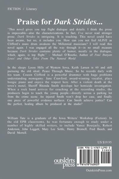 Praise for Dark Strides... "This novel gives you top flight dialogue and details. I think the prose is impeccable-also the characterizations. In fact, I've never read stronger prose. Dark Strides is intriguing. It is touching. This novel could have been arcane, but no, it includes you. How can you not feel ALIVE as Clifford's snare drum awakens the Millennial musicians? I will read this novel again. I was engaged all the way through it-in no small measure because Dark Strides contains plenty of humor, mostly in the dialogue, which, again, is top flight." - Michael O'Rourke, Author of Paul Bunyan Lives! and Other Tales From The Natural World. In the sleepy Loess Hills of Western Iowa, Keith Larsen is 60 and still pursuing the old ideal, Peace Through Music. So he records daily with his team. Cousin Clifford is a powerful drummer with huge problems understanding monogamy. Jane Crawford, award-winning vocalist, plays boogie piano and enjoys the respect here. After a violent death at the town's motel, Sheriff Rhonda Smith develops her homicide investigation. When a rock band arrives for coaching at the recording studio, the producers begin to teach the young people-directly across a parking lot from the crime scene. An injured Smith won't drop her case, and finally one piece of powerful evidence surfaces. Can Smith achieve justice? Can the perfect, healing album be produced at the studio?