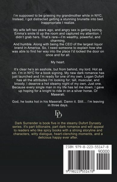 In book five of the Dufort Dynasty series by bestselling author Juliette N Banks, Logan Dufort, a billionaire CEO heads to NYC and meets a romance author, only to find himself entangled in a sexy story he wasn't prepared for. I'm supposed to be grieving my grandmother while in NYC. Instead, I got distracted with getting a stunning brunette into bed. Inappropriate I realize. My wife left two years ago, and being angry is getting boring. Emma's smile lit up the room and captured my attention. I didn't grab hers. That's rare-I'm wealthy, powerful, and charming. And humble. Along with being the CEO of the largest liquor brand in America. So, I need someone to explain how she was able to find her way into the place I'd locked the door on once and for all. My heart. Emma It's clear he's an asshole, but from behind, my lord. Hot as sin. I'm in NYC for a book signing. My new dark romance has just launched and I'm ready for one of my own. Logan Dufort has all the attributes I'm looking for; tall, muscular, and broody. I deserve a hot steamy night of my own. Just one. Because every single man in my life has let me down. I gave up hoping for a knight to ride in on a silver horse. Or Maserati. God, he looks hot in his Maserati. Damn it. Still... I'm leaving in three days. Dark Surrender is book five in the steamy Dufort Dynasty series. It's part billionaire, part dark romance and will appeal to readers who like spicy books with a strong storyline and characters, witty dialogue, heart-clenching moments, and a delicious happy ever after.