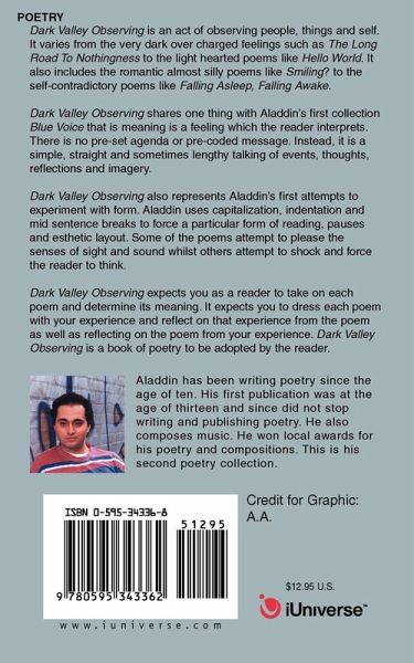 Dark Valley Observing is an act of observing people, things and self. It varies from the very dark over charged feelings such as The Long Road To Nothingness to the light hearted poems like Hello World. It also includes the romantic almost silly poems like Smiling? to the self-contradictory poems like Falling Asleep, Falling Awake. Dark Valley Observing shares one thing with Aladdin's first collection Blue Voice that is meaning is a feeling which the reader interprets. There is no pre-set agenda or pre-coded message. Instead, it is a simple, straight and sometimes lengthy talking of events, thoughts, reflections and imagery. Dark Valley Observing also represents Aladdin's first attempts to experiment with form. Aladdin uses capitalization, indentation and mid sentence breaks to force a particular form of reading, pauses and esthetic layout. Some of the poems attempt to please the senses of sight and sound whilst others attempt to shock and force the reader to think. Dark Valley Observing expects you as a reader to take on each poem and determine its meaning. It expects you to dress each poem with your experience and reflect on that experience from the poem as well as reflecting on the poem from your experience. Dark Valley Observing is a book of poetry to be adopted by the reader.
