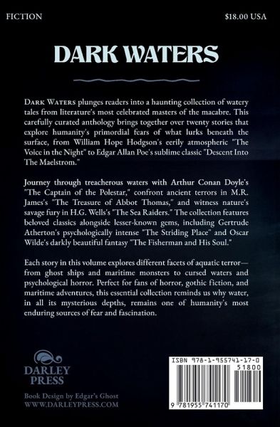 Dark Waters plunges readers into a haunting collection of watery tales from literature's most celebrated masters of the macabre. This carefully curated anthology brings together over twenty stories that explore humanity's primordial fears of what lurks beneath the surface, from William Hope Hodgson's eerily atmospheric "The Voice in the Night" to Edgar Allan Poe's sublime classic "Descent Into The Maelstrom." Journey through treacherous waters with Arthur Conan Doyle's "The Captain of the Polestar," confront ancient terrors in M.R. James's "The Treasure of Abbot Thomas," and witness nature's savage fury in H.G. Wells's "The Sea Raiders." The collection features beloved classics alongside lesser-known gems, including Gertrude Atherton's psychologically intense "The Striding Place" and Oscar Wilde's darkly beautiful fantasy "The Fisherman and His Soul." Each story in this volume explores different facets of aquatic terror- from ghost ships and maritime monsters to cursed waters and psychological horror. Perfect for fans of horror, gothic fiction, and maritime adventures, this essential collection reminds us why water, in all its mysterious depths, remains one of humanity's most enduring sources of fear and fascination.