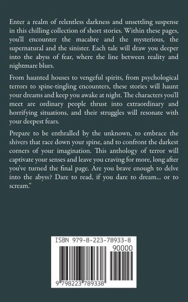 "Enter a realm of relentless darkness and unsettling suspense in this chilling collection of short stories. Within these pages, you'll encounter the macabre and the mysterious, the supernatural and the sinister. Each tale will draw you deeper into the abyss of fear, where the line between reality and nightmare blurs. From haunted houses to vengeful spirits, from psychological terrors to spine-tingling encounters, these stories will haunt your dreams and keep you awake at night. The characters you'll meet are ordinary people thrust into extraordinary and horrifying situations, and their struggles will resonate with your deepest fears. Prepare to be enthralled by the unknown, to embrace the shivers that race down your spine, and to confront the darkest corners of your imagination. This anthology of terror will captivate your senses and leave you craving for more, long after you've turned the final page. Are you brave enough to delve into the abyss? Dare to read, if you dare to dream... or to scream."