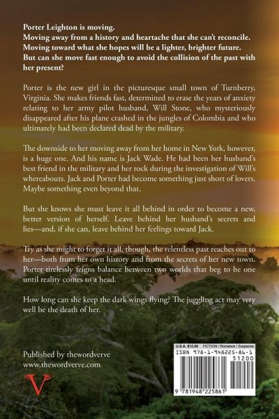 Porter Leighton is moving. Moving away from a history and heartache that she can’t reconcile. Moving toward what she hopes will be a lighter, brighter future. But can she move fast enough to avoid the collision of the past with her present? Porter is the new girl in the picturesque small town of Turnberry, Virginia. She makes friends fast, determined to erase the years of anxiety relating to her army pilot husband, Will Stone, who mysteriously disappeared after his plane crashed in the jungles of Colombia and who ultimately had been declared dead by the military. The downside to her moving away from her home in New York, however, is a huge one. And his name is Jack Wade. He had been her husband’s best friend in the military and her rock during the investigation of Will’s whereabouts. Jack and Porter had become something just short of lovers. Maybe something even beyond that. But she knows she must leave it all behind in order to become a new, better version of herself. Leave behind her husband’s secrets and lies—and, if she can, leave behind her feelings toward Jack. Try as she might to forget it all, though, the relentless past reaches out to her—both from her own history and from the secrets of her new town. Porter tirelessly feigns balance between two worlds that beg to be one until reality comes to a head. How long can she keep the dark wings flying? The juggling act may very well be the death of her.