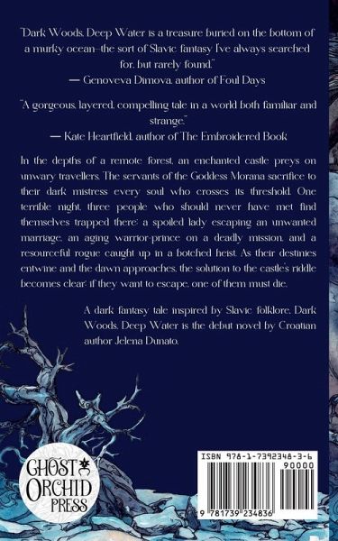 In the depths of a remote forest, an enchanted castle preys on unwary travellers. The servants of the Goddess Morana sacrifice to their dark mistress every soul who crosses its threshold. One terrible night, three people who should never have met find themselves trapped there: a spoiled lady escaping an unwanted marriage, an aging warrior-prince on a deadly mission, and a resourceful rogue caught up in a botched heist. As their destinies entwine and the dawn approaches, the solution to the castle's riddle becomes clear: if they want to escape, one of them must die. A dark fantasy tale inspired by Slavic folklore, Dark Woods, Deep Water is the debut novel by Croatian author Jelena Dunato. Set in an intricately imagined world that staggers the line between fairytale and brutality, this novel will appeal to fans of Katherine Arden and Naomi Novik, as well as lovers of classic Gothic fiction.