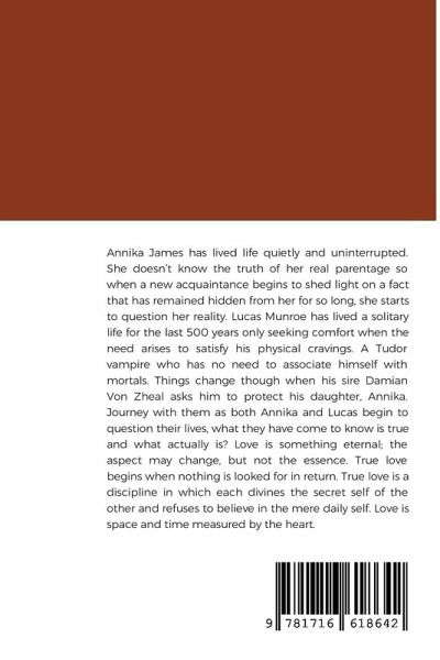 Annika James has lived life quietly and uninterrupted. She doesn't know the truth of her real parentage so when a new acquaintance begins to shed light on a fact that has remained hidden from her for so long, she starts to question her reality. Lucas Munroe has lived a solitary life for the last 500 years only seeking comfort when the need arises to satisfy his physical cravings. A Tudor vampire who has no need to associate himself with mortals. Things change though when his sire Damian Von Zheal asks him to protect his daughter, Annika. Journey with them as both Annika and Lucas begin to question their lives, what they have come to know is true and what actually is? Love is something eternal; the aspect may change, but not the essence. True love begins when nothing is looked for in return. True love is a discipline in which each divines the secret self of the other and refuses to believe in the mere daily self. Love is space and time measured by the heart.