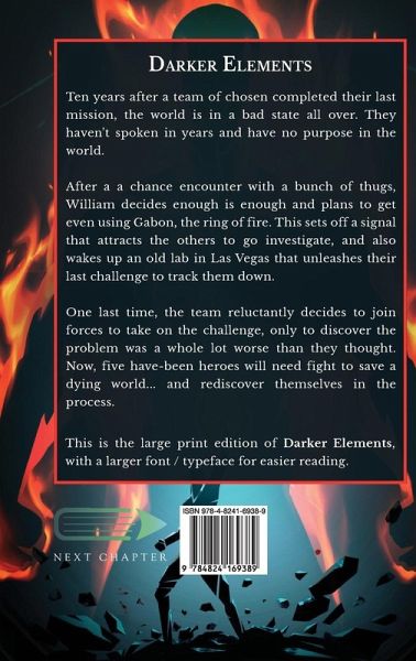 Ten years after a team of chosen completed their last mission, the world is in a bad state all over. They haven't spoken in years and have no purpose in the world. After a a chance encounter with a bunch of thugs, William decides enough is enough and plans to get even using Gabon, the ring of fire. This sets off a signal that attracts the others to go investigate, and also wakes up an old lab in Las Vegas that unleashes their last challenge to track them down. One last time, the team reluctantly decides to join forces to take on the challenge, only to discover the problem was a whole lot worse than they thought. Now, five have-been heroes will need fight to save a dying world... and rediscover themselves in the process. This is the large print edition of Darker Elements, with a larger font / typeface for easier reading.