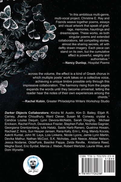 Christine E. Ray places her original poetry and prose alongside the fierce words and artwork of 44 talented international collaborators in her latest offering, Darker Objects. Poignant Poetic solos, duets, and provocative political anthems are possessed with evocative titles illustrating their focus, including; 'American Gothic', 'Ghosted', 'Nocturnes', 'Viral' 'Rooms so Still, So Silent', 'Tongue-Tied', 'Tenterhooks', 'Rage Against the Machine', and 'Feminist Manifesto'. These lightening threads of passion, rage, love, and grief are the dark, irresistible heart of Darker Objects. Collaborators include creatives from around the globe with a multitude of talent: Kindra M. Austin, Kim D. Bailey, Elijah R. Carney, Jharna Choudhury, Ward Clever, Susan M. Conway, crystal x, Candice Louisa Daquin, Sarah Doughty. OldePunk, Michael Erickson, Rachel Finch, Devereaux Frazier, Stephen Fuller, Nicholas Gagnier, Georgiana Grentzenberg, Iulia Halatz, Saide Harb-Ranero, Quatrina Hosain, Rachael Z. Ikins, Sun Hesper Jansen, Rana Kelly, Erin L. King, Mandy Kocsis, Aakriti Kuntal, John W. Leys, Lois Linkens, Nicole Lyons, Jamie Lynn Martin, Devika Mathur, Nathan McCool, S.K. Nicholas, Dom Wynette, Jack Neece, Allister Nelson, Jesica Nordase, Basiliké Pappa, Zelda Raville, Lynn Devora-McNabb, Kristiana Reed, Megha Sood, Eric Syrdal, Marcia J. Weber, Robert Wertzler, and Laurie Wise