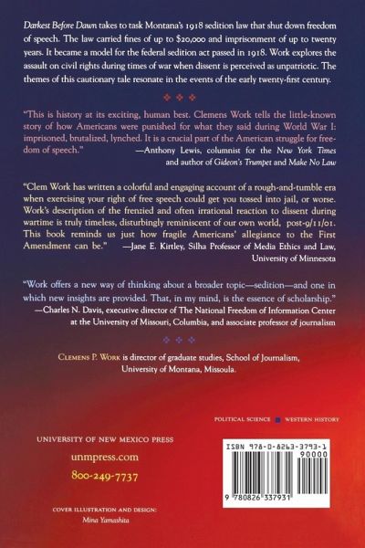 Two weeks after the United States declared war on Germany in 1917, the town of Lewistown, Montana, held a patriotic parade. Less than a year later, a mob of 500 Lewistown residents burned German textbooks in Main Street while singing The Star Spangled Banner. In Lewistown's nationalistic fervor, a man was accused of being pro-German because he didn't buy Liberty Bonds; he was subsequently found guilty of sedition. Montana's former congressman Tom Stout was quoted in the town's newspaper, The Democrat-News, "With our sacred honor and our liberties at stake, there can be but two classes of American citizens, patriots and traitors!" Darkest Before Dawn takes to task Montana's 1918 sedition law that shut down freedom of speech. The sedition law carried fines of up to $20,000 and imprisonment for as many as twenty years. It became a model for the federal sedition act passed in 1918. Clemens Work explores the assault on civil rights during times of war when dissent is perceived as unpatriotic. The themes of this cautionary tale clearly resonate in the events of the early twenty-first century. "This is history at its exciting, human best. Clemens Work tells the little-known story of how Americans were punished for what they said during World War I: imprisoned, brutalized, lynched. It is a crucial part of the American struggle for freedom of speech."--Anthony Lewis, columnist for the New York Times and author of Gideon's Trumpet and Make No Law