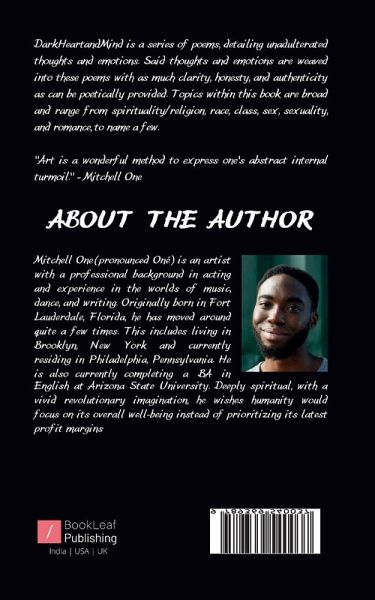 DarkHeartandMind is a series of poems, detailing unadulterated thoughts and emotions. Said thoughts and emotions are weaved into these poems with as much clarity, honesty, and authenticity as can be poetically provided. Topics within this book are broad and range from spirituality/religion, race, class, sex, sexuality, and romance, to name a few. ""Art is a wonderful method to express one's abstract internal turmoil."" - Mitchell One
