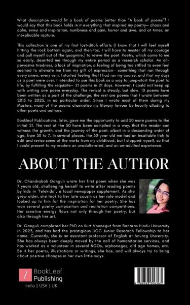 ""What description would fit a book of poems better than "A book of poems"? I would say that this book holds in it everything that inspired my poetry- chaos and calm, ennui and inspiration, numbness and pain, horror and awe, and at times, an inexplicable rapture. This collection is one of my first last-ditch efforts (I know that I will feel myself hitting the rock bottom again, and then too, I will have to muster all my courage and pull myself out of the quagmire.) to revive the poet. Poetry, which came to me so easily, deserted me through my entire period as a research scholar. An all-pervasive tiredness, a lack of inspiration, a feeling of being too stifled to even feel seemed to alienate me from my gift of expression- something that ran through every sinew, every vein. I started feeling that I had run my course, and that my days as a poet were over. I intended to use this book as a way to jump-start the poet to life, by fulfilling the requisite- 21 poems in 21 days. However, I could not keep up with writing one poem everyday. The revival is steady, but slow. 10 poems have been written as a part of the challenge, the rest are poems that I wrote between 2015 to 2023, in no particular order. Since I wrote most of them during my Masters, many of the poems channelise my literary fervour by heavily alluding to other poets and authors. Bookleaf Publications, later, gave me the opportunity to add 50 more poems to the initial 21. The rest of the 50 have been compiled in a way, that the reader can witness the growth, and the journey of the poet, albeit in a descending order of age, from 30 to 7. In several places, the 30-year-old me had an insatiable itch to edit and revise some of the works from my childhood, but I stopped myself, so that I could present to my readers an unadulterated, and an un-adulted experience.""